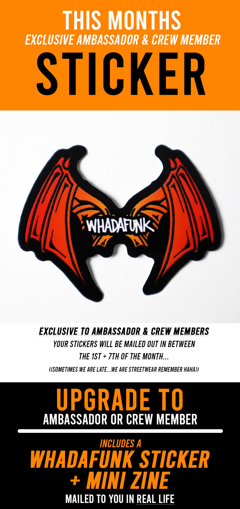 This month's exclusive WHADAFUNK sticker (not available anywhere else) - mailed out monthly for all Ambassador & Crew members.. Each month is a brand new sticker!